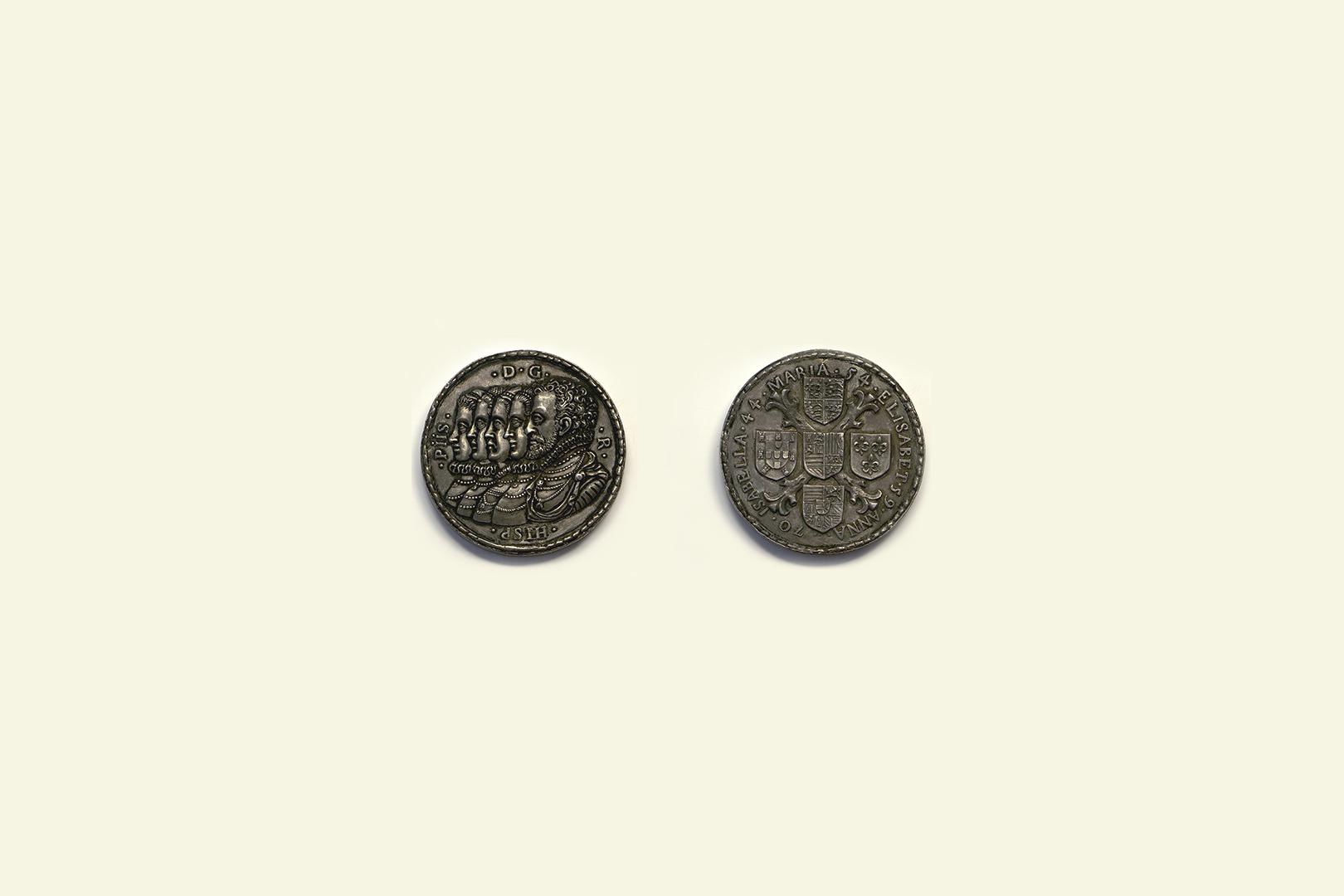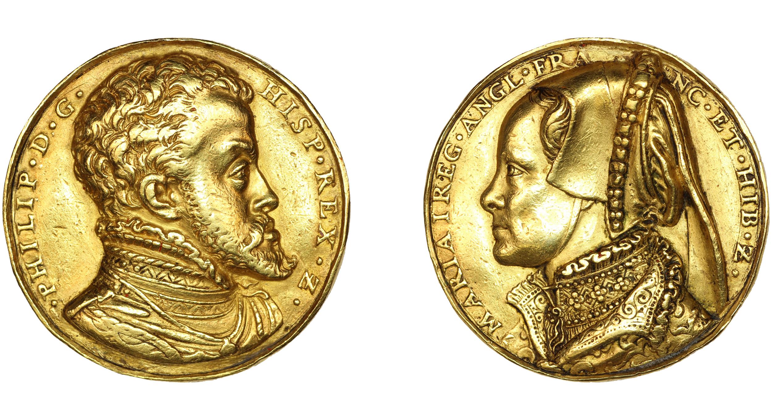 Jacques Jonghelinck (1530 – 1606), a Flemish medallist, began his service to the king in 1555 as a royal seal-engraver. He was inspired by da Trezzo, if not worked with him, and depicted medals depicting the busts of the couple.